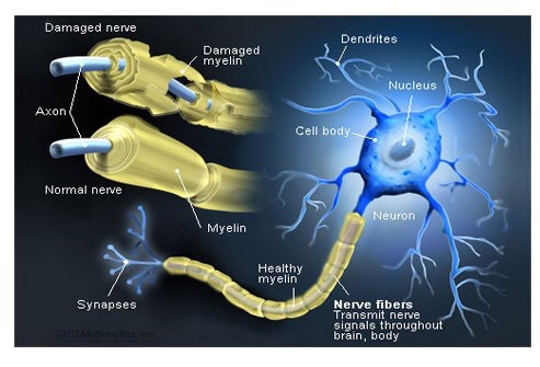 This image shows the damaged nerve lining, called the myelin sheath. This is what’s happening now, and scars remain from previous damage. HAs I stated, I’ll take a stop to this, thanks.