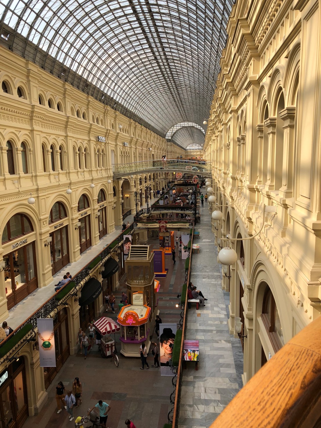 The old parliament just inside the Kremlin. It looks like you can go anywhere, but step off the tourist path and a Russia soldier with a very large rifle stops you very quickly ! I stepped onto the road to get a photograph and was very clearly put back on the allowable path.A quiet corner, and it always pays to look up. The detail is incredible, and easy to miss the corners and quiet spots.Anyone who knows Moscow will know how long it took me to get that shot with so few people in it. I am going to be politically incorrect and say I hate Chinese tour groups, they are rude and pushy and noisy, Moscow would be better without them.Another cathedral, beside the old palace. Putin doesn’t live here, the Tsars used to live hereThe gate leaving the Kremlin, unseasonably warm and a beautiful gardenThe walls of the Kremlin, just as you leave and enter Red Square. St Basil’s is just behind youAnd for a complete change, the GUM shopping centre, completely over the top and full of designer clothing, watch and jewellery stores. I doubt many Russians can afford to shop hereThat Metro ! it’s amazing, the Community youth volunteered en masse to construct the Metro, as civic duty and pride in their city dictated.Not a bad commute to workthe top of the escalators leading to street levelFood is important ! Borsht soup, two salads and a pot of tea for $9 AUD. I’m comfortably full if not stuffed now.