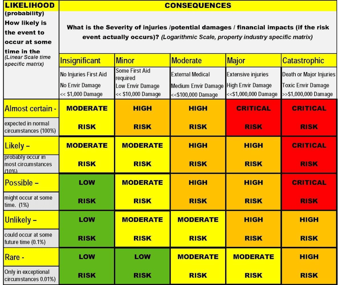 - high likelihood and high consequence; a traffic accident on a busy street when distracted on the phone causing a major injury or fatality. I struggled the most with the example for this one, so had to bring in the distraction factor, but this is a risk scenario that all of us face in our daily lives. Most of us don’t face high likelihood, high consequence hence severe risk activities in our daily lives. However, the scenario of a busy road, distraction due to domestic issues maybe, using the mobile, and taking that mis-timed step off the pavement into the path of a moving vehicle is real to all of us.