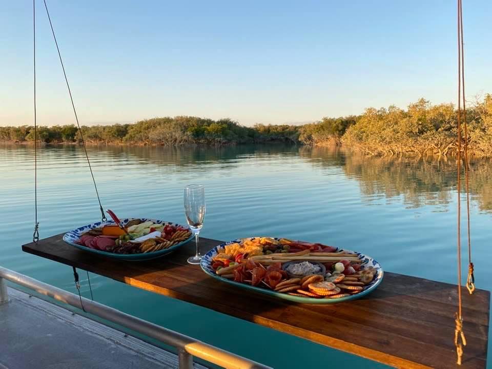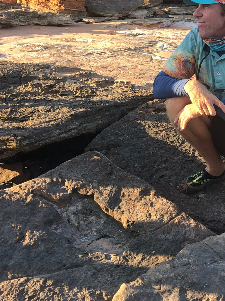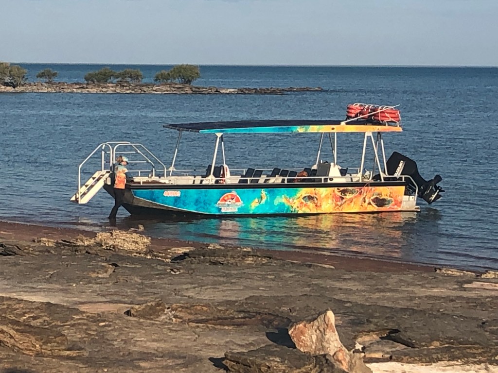 The dinosaur footprint tour was lovely, a brightly painted flat bottom boat took us across Roebuck Bay to see sauropod and therapod footprints. Then we were taken up the creek for sparkling wine, cheese and biscuits surrounded by water birds, then back to the beach for more food as the sun set glowing on the red cliffs.