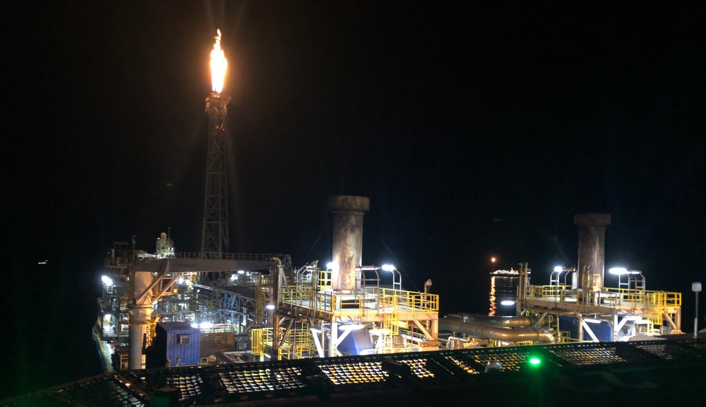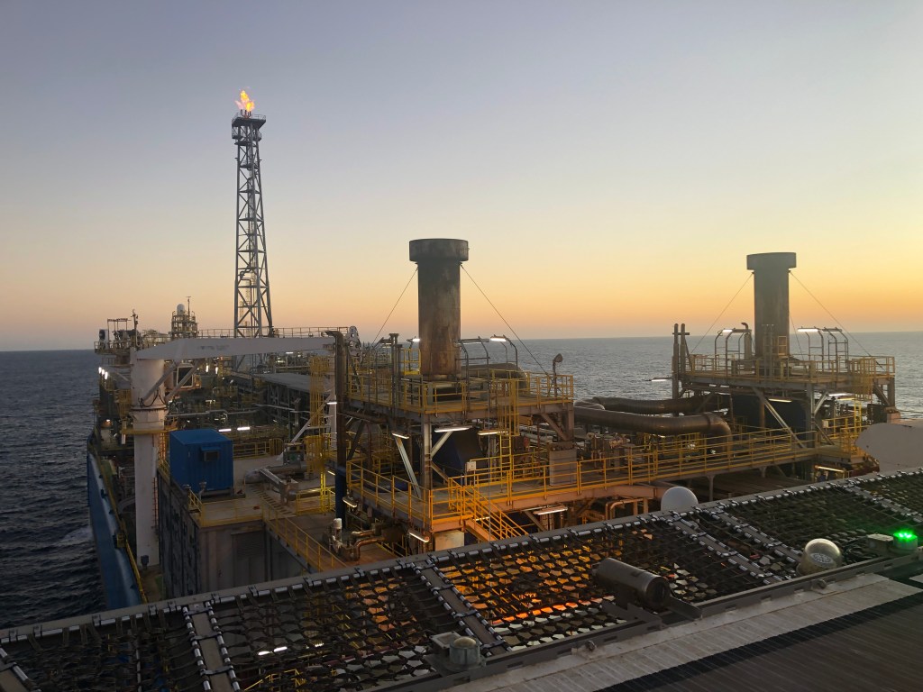 - climbed down ladders to the moon pool, clambering around steelwork. That’s the area where the production riser comes up from the seabed through the water and then through the ship to the production equipment, and there is a beautiful, glowing ring of blue water beneath you