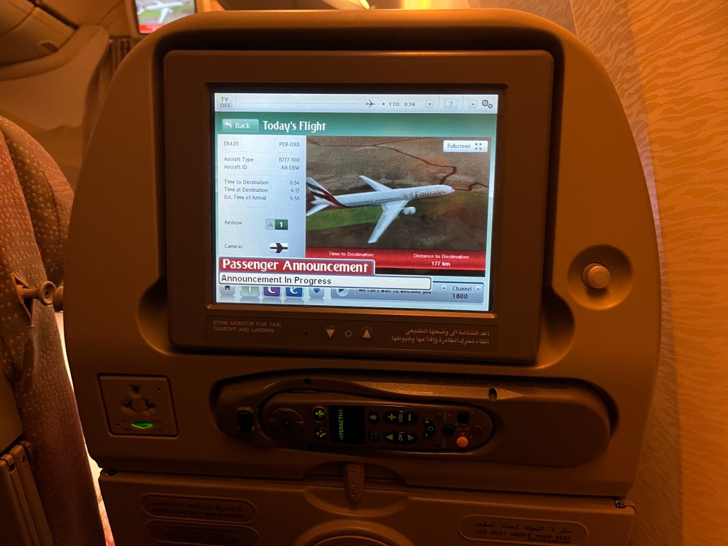 This has been my view for the last 10 hours, in the Perth to Dubai leg of my trip to the UK and Europe. This is the first time I’ve left Australia since going to Russia for the treatment, and I had forgotten what long haul flights are like ! It’s been fine and Emirates are a good airline, but I’m aching and cramped. The toilet line was huge, and we had a spoiled child screaming intermittently.