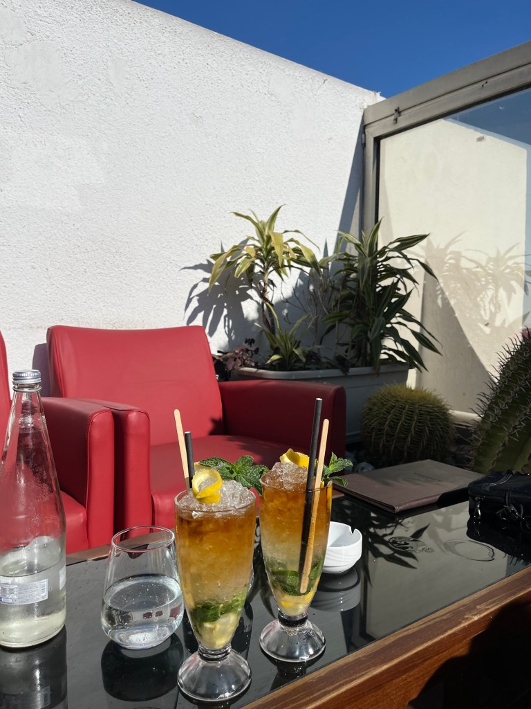 Casablanca; getting lost and walking the wrong direction so missing the Medina completely but being helped by two great gentlemen. A well needed cocktail at the rooftop bar in our hotel.