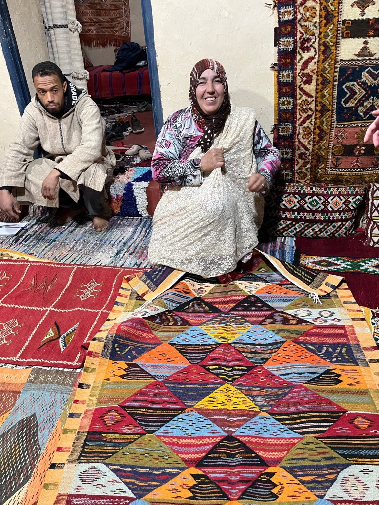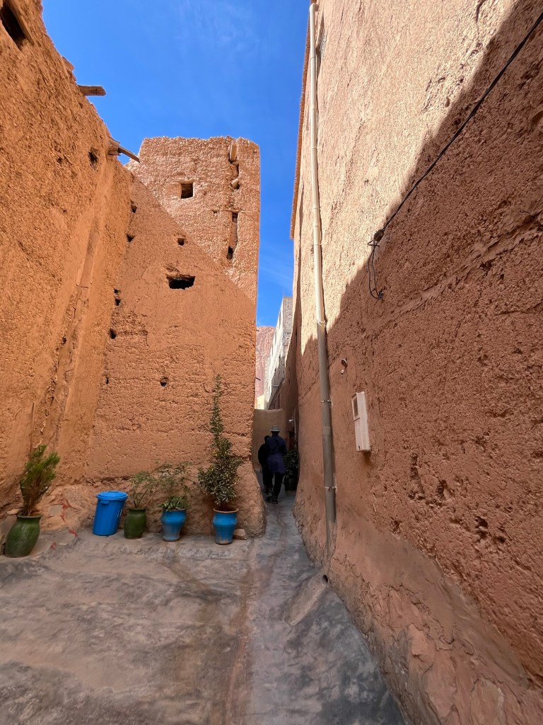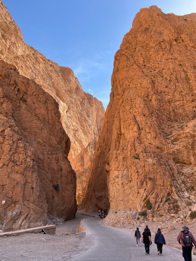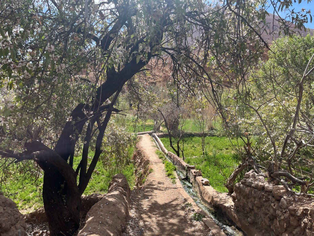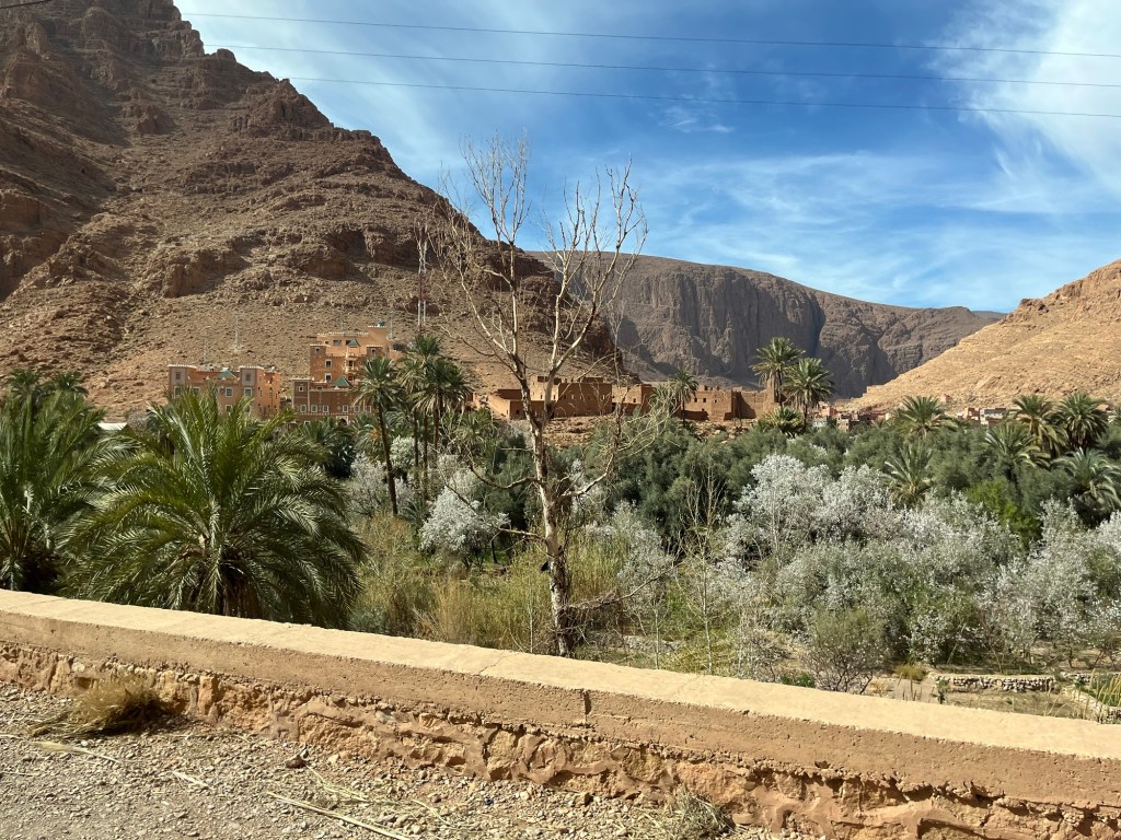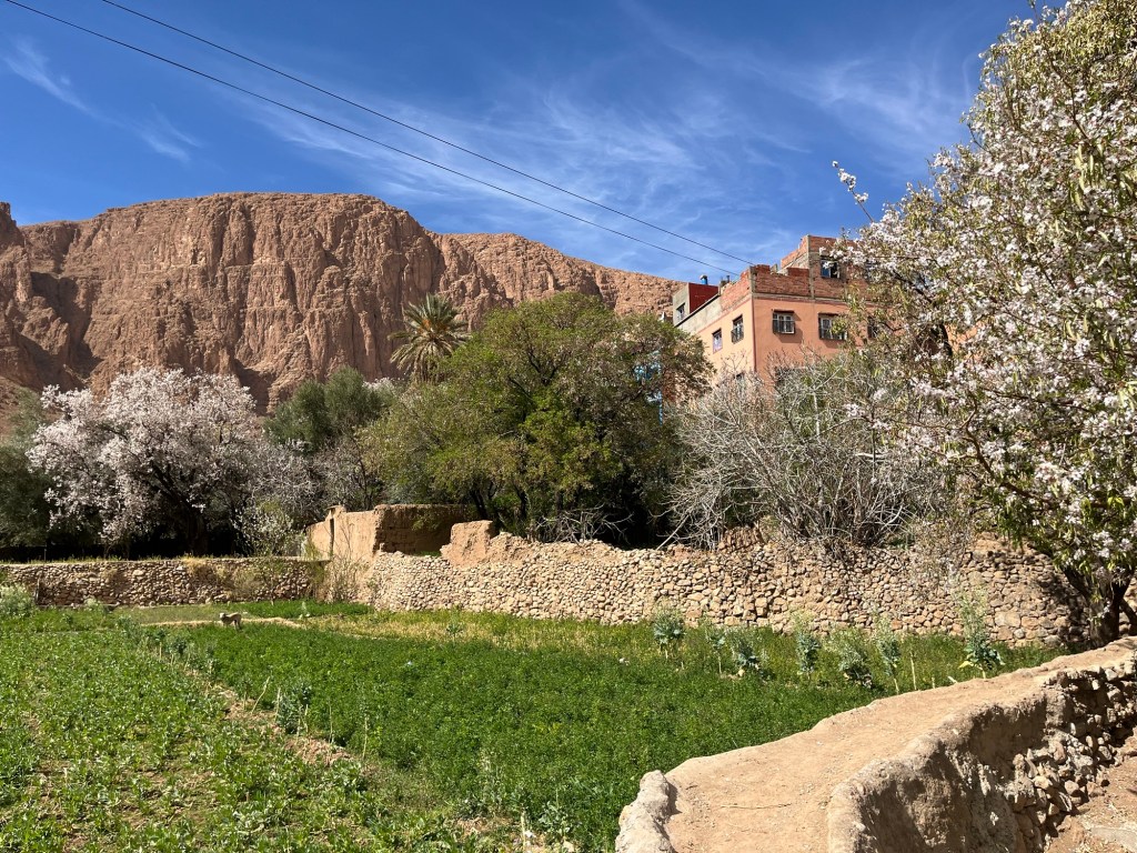 Almond trees, towering gorge walls, Berber carpet workshops, irrigated fields at the base of the gorge.