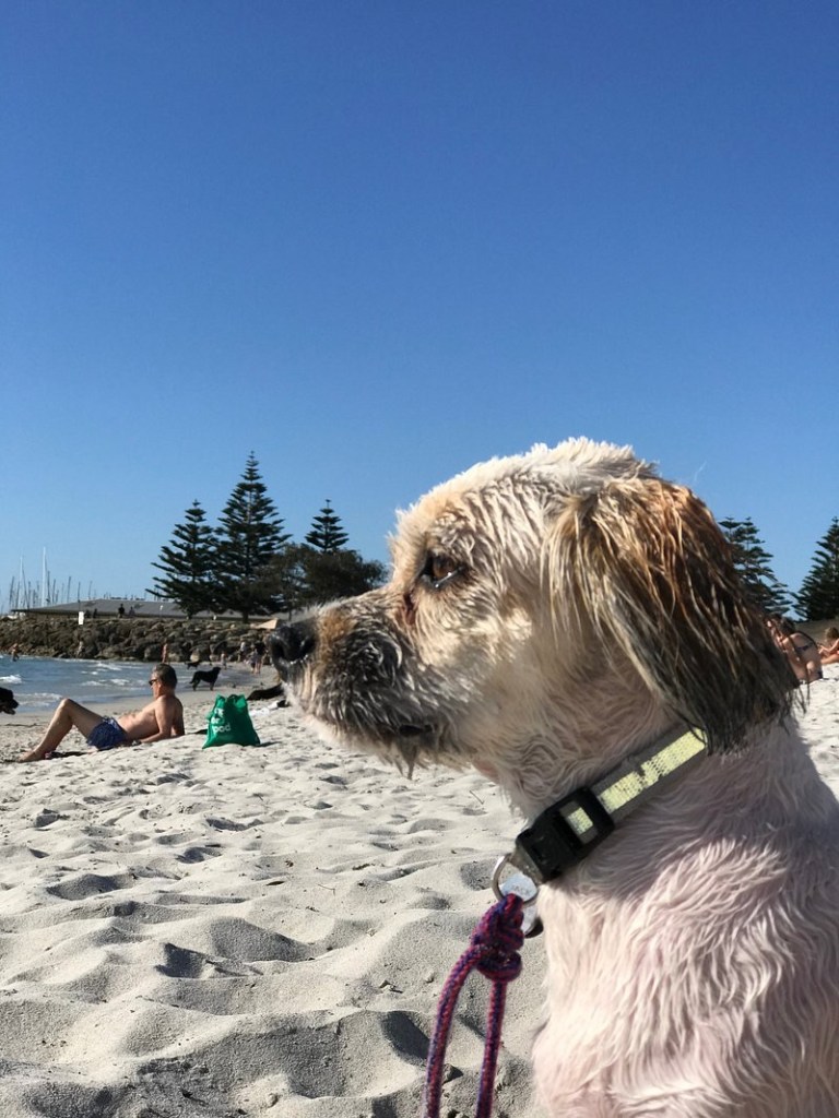 I had a lovely morning at the dog beach today, with a pleasant coolness to the air at 8am warming up, and still-warm water in which to swim. There was parking easily found, and not too many people. Autumn is a lovely time here, as the fierce heat drops off and the rains start. We had rain this week due to a cyclone far north of here and it was lovely to see clouds again. Everything is growing again, finally.