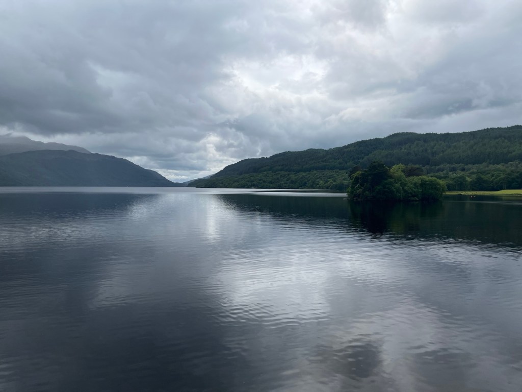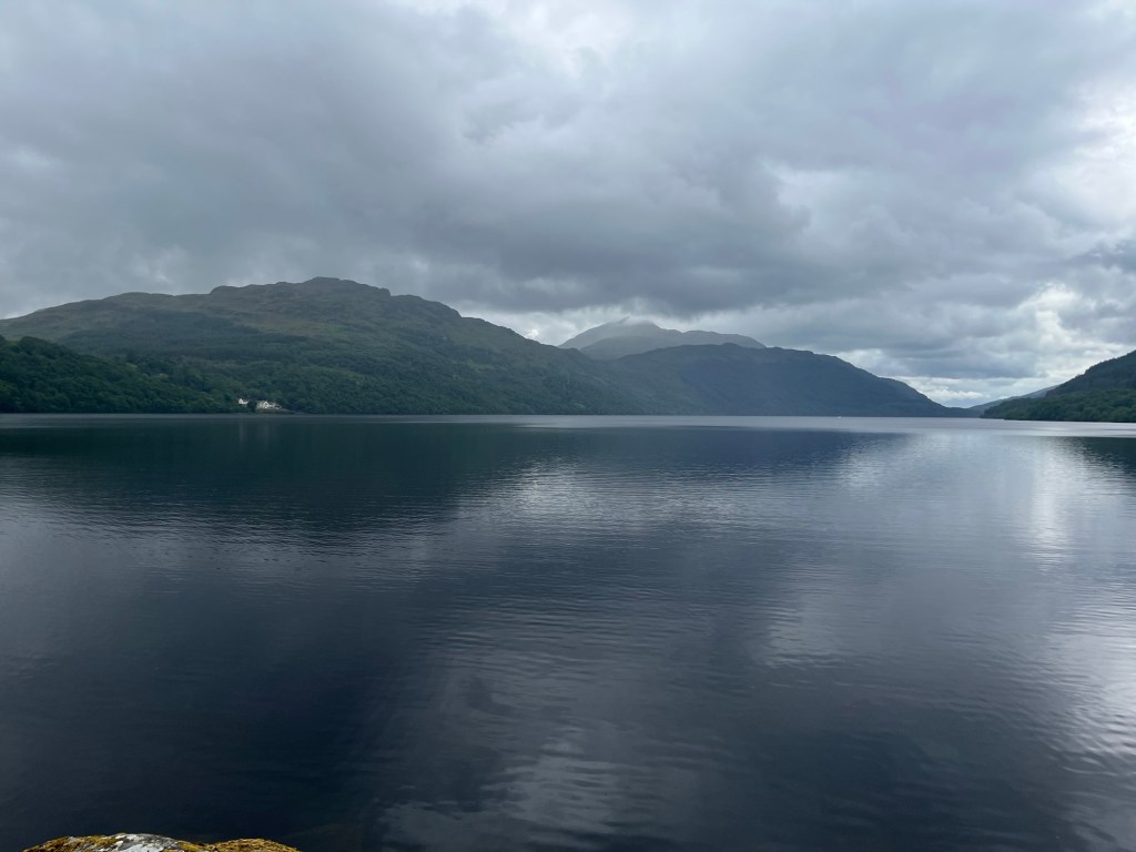 Driving down the side of Loch Lomond, in misty rain clearing sometimes to show the water and hills.