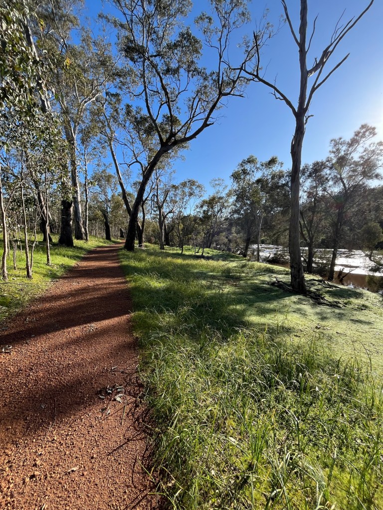 9km of woodland and bush and kangaroos, on a cold and clear morning, enjoying looking at the Avon River flowing well.