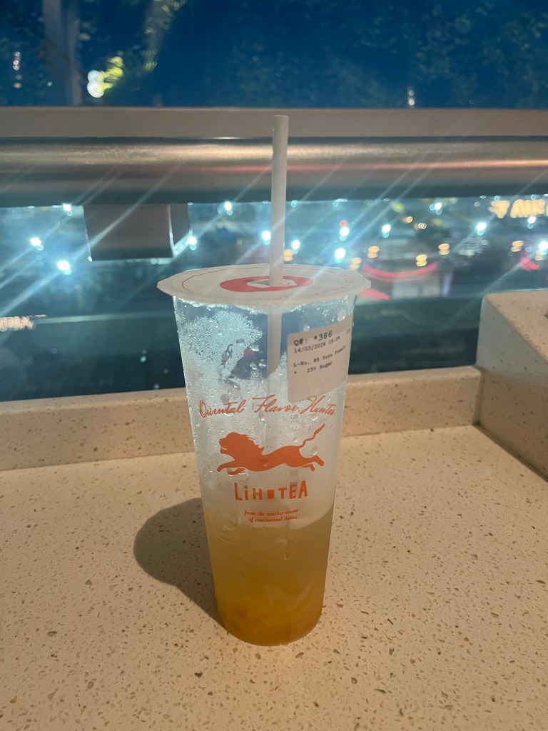 The first stage of the journey and an exceedingly sweet fruit tea in Singapore airport. I asked for low sugar, got 25% (25% of what, I have no idea, pure sugar syrup maybe) which is making my teeth ache. However it’s cold and refreshing so will be just fine.